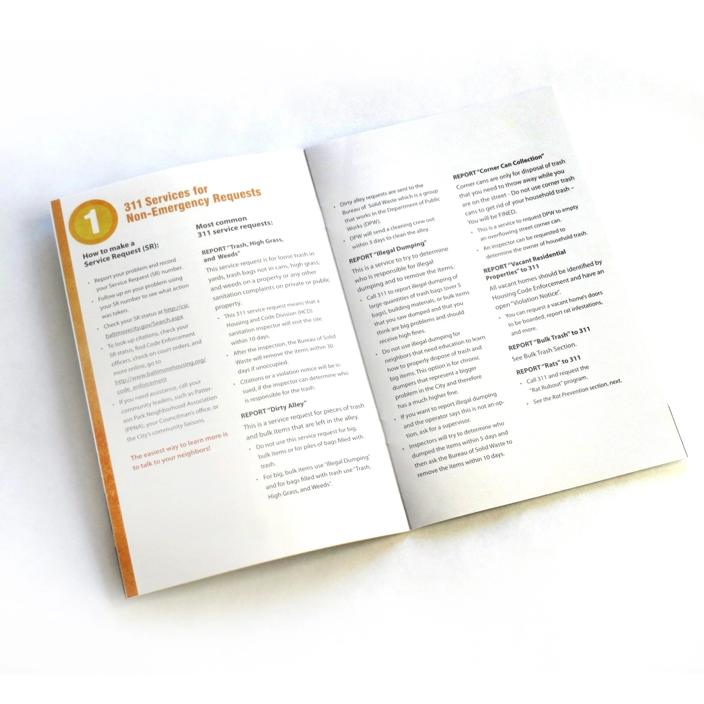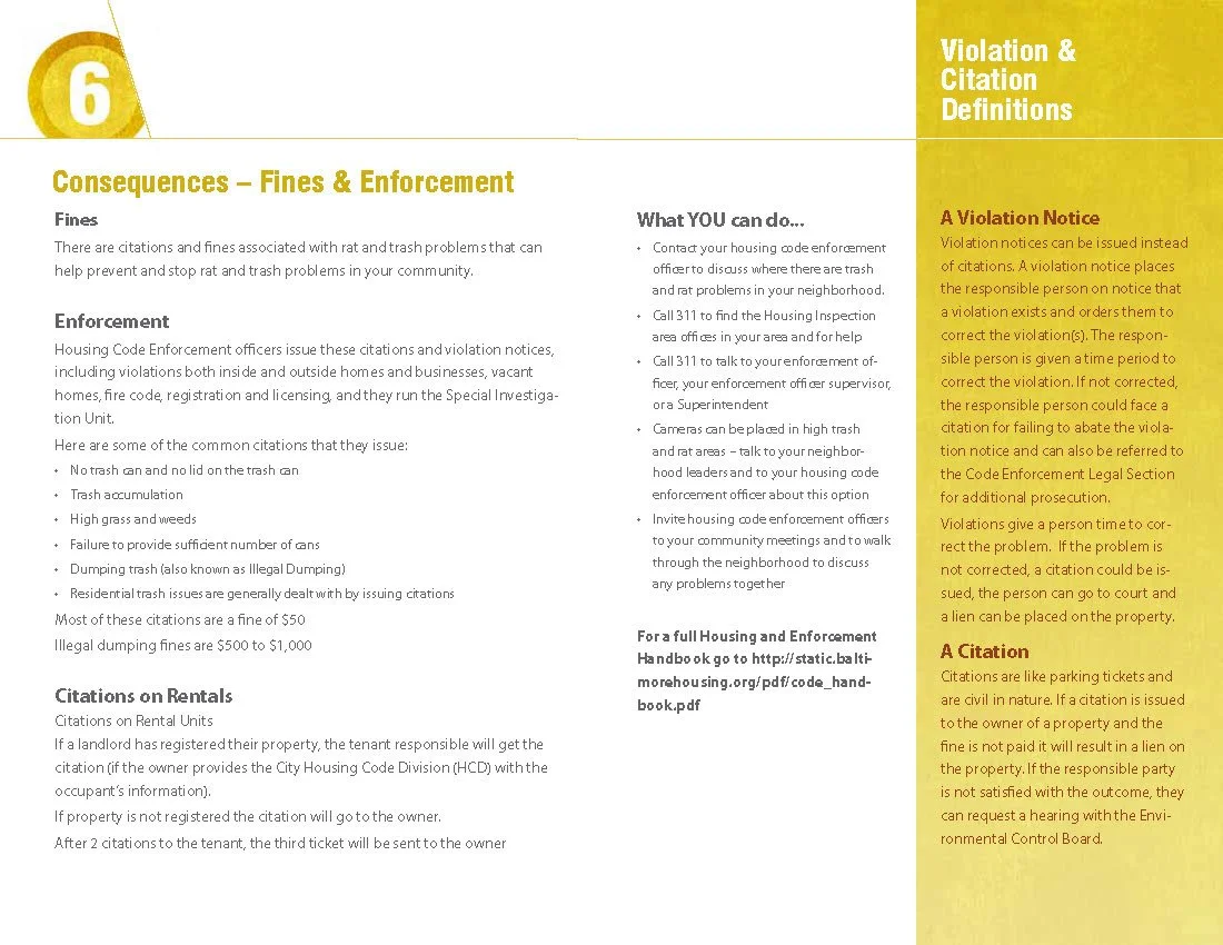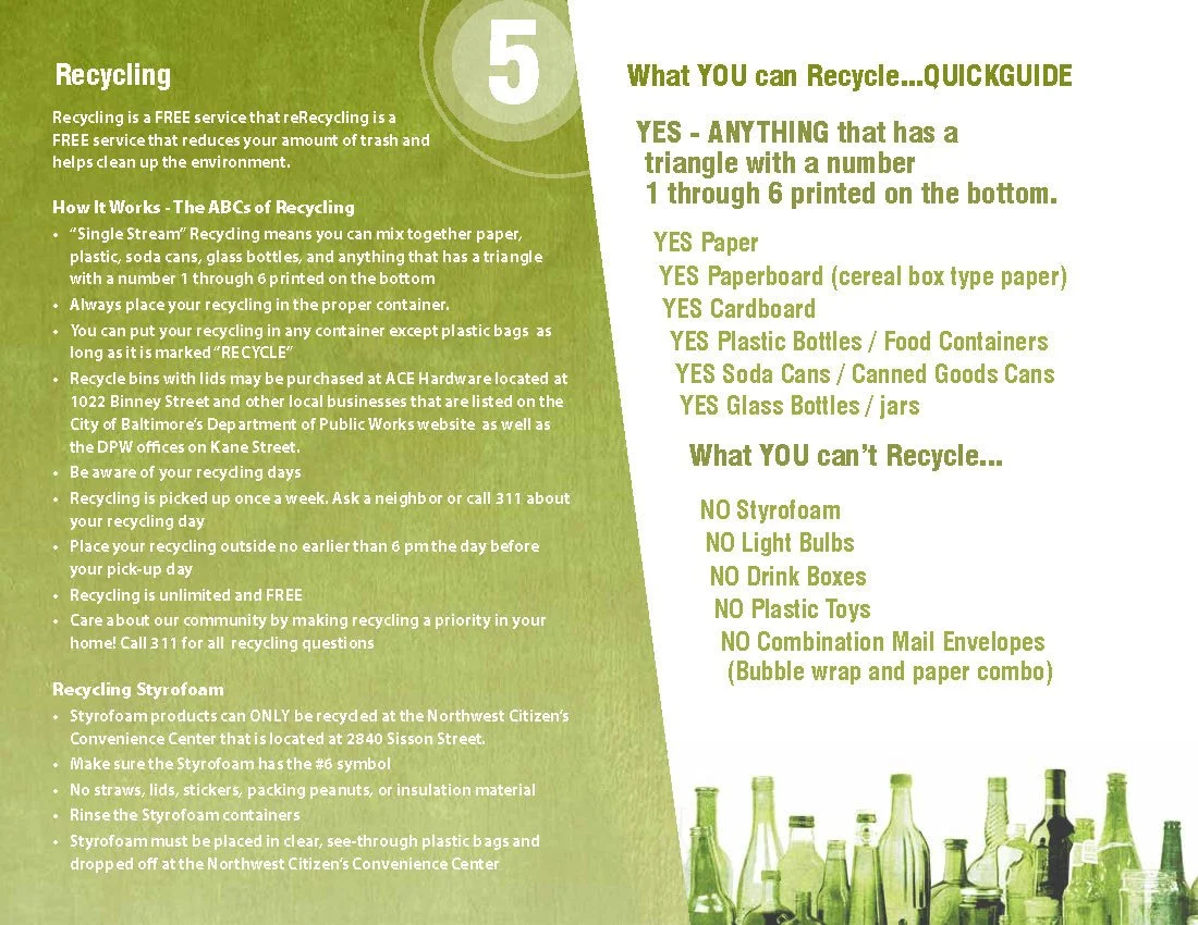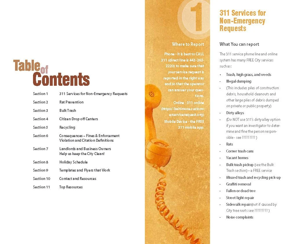 Originally the Patterson Park Clean City Guide, this 20 page grant-funded booklet was written by volunteers of the Patterson Park Neighborhood Association and adopted by Baltimore City. It covers a variety of issues related to keeping the city clean and trash-free including use of the Baltimore 311 app used for problem reporting by residents. The guide is comprehensive and easy to read.