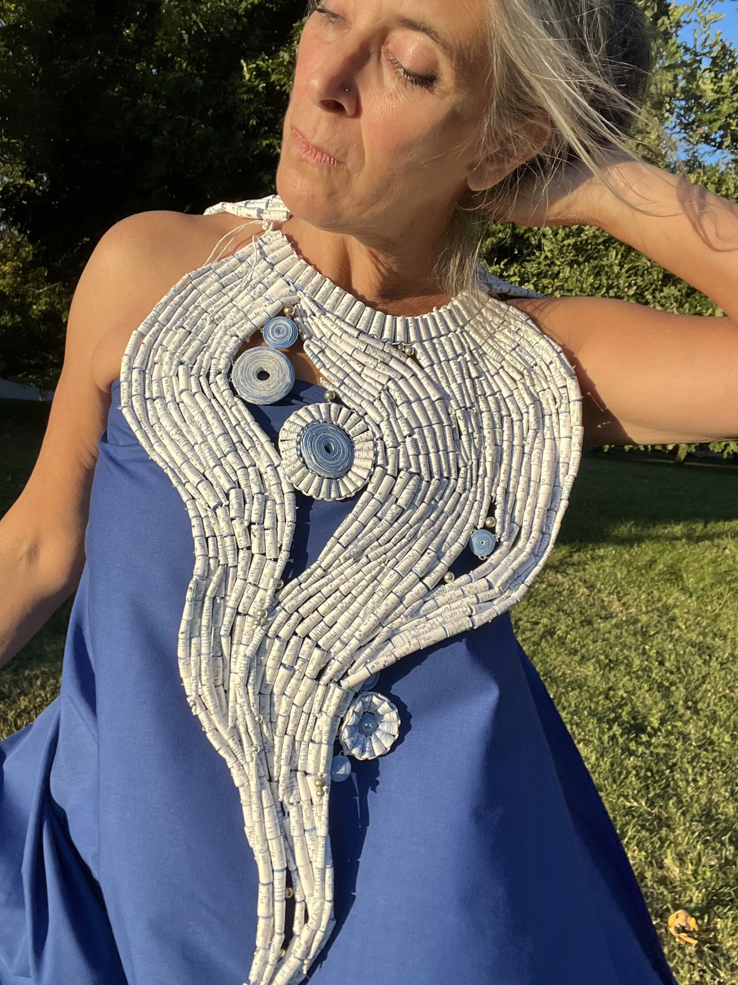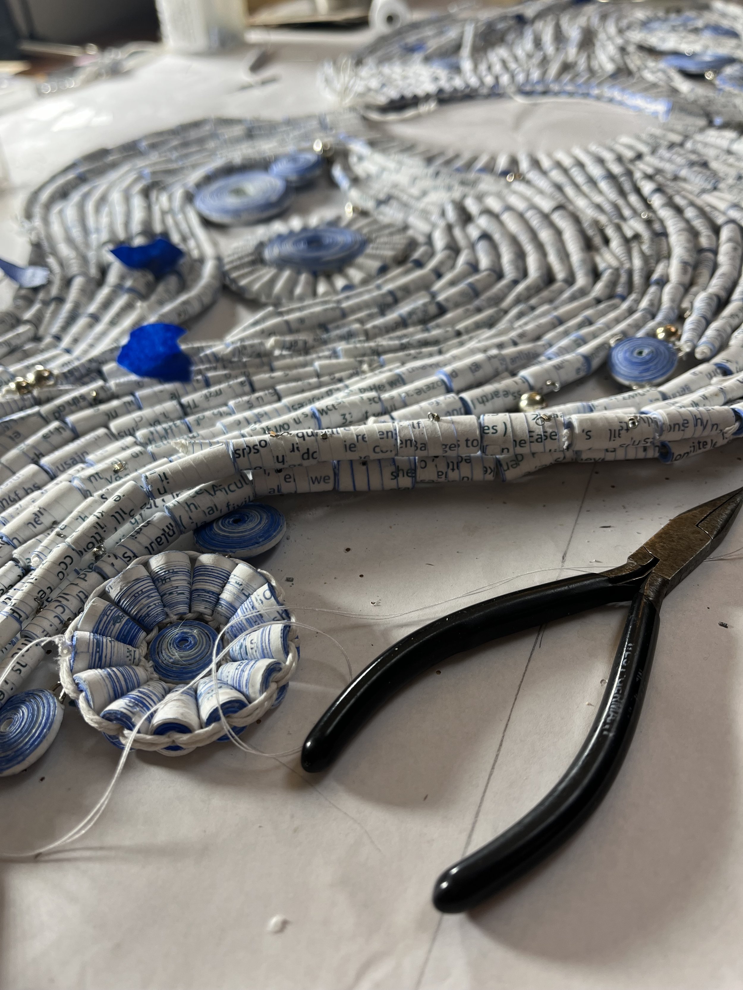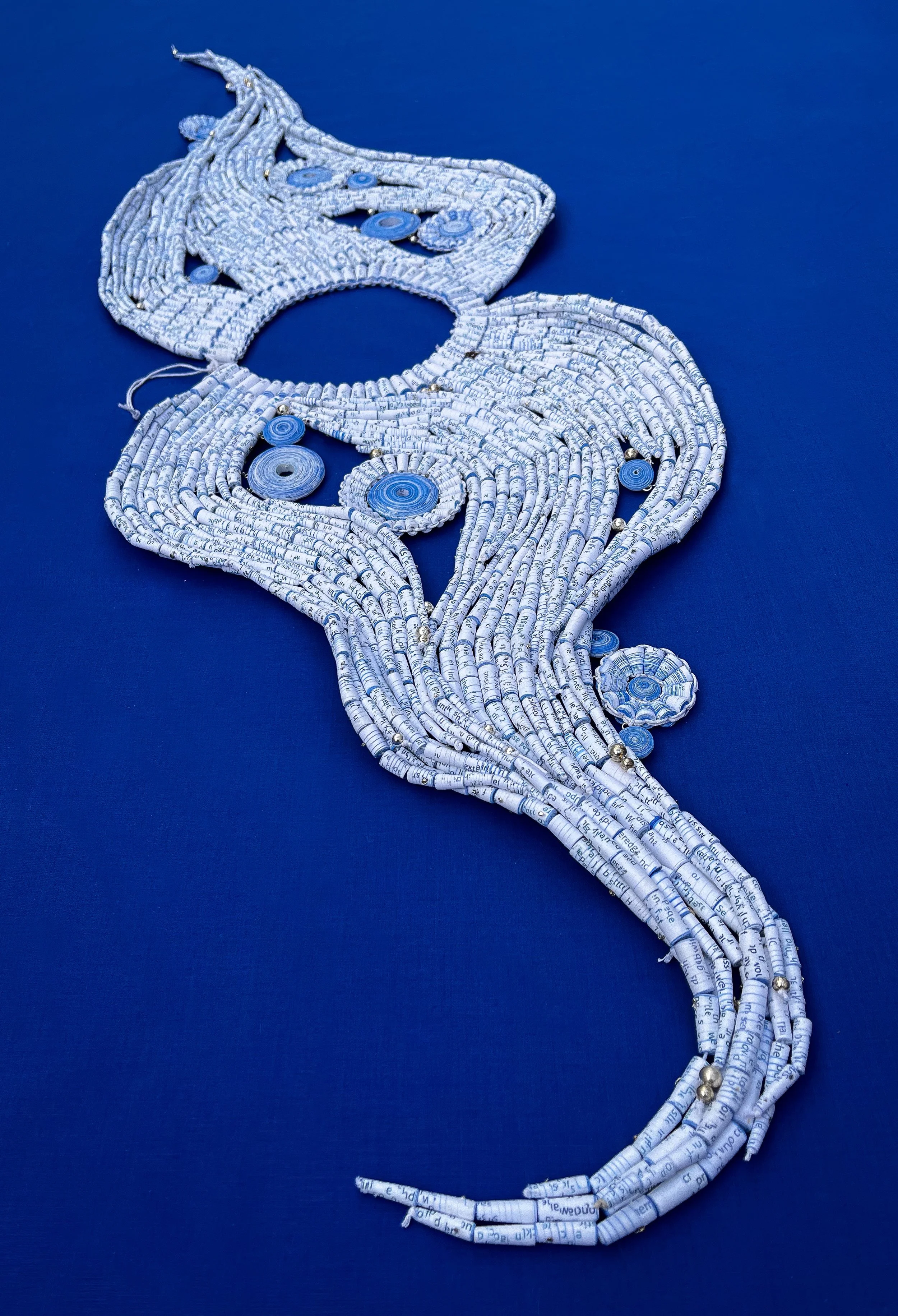 "Earle Necklace" is a neckpiece formed from 1800 paper beads imprinted with text from Oceanographer Sylvia Earle's book "The World is Blue: How Our Fate and the Ocean's are One".